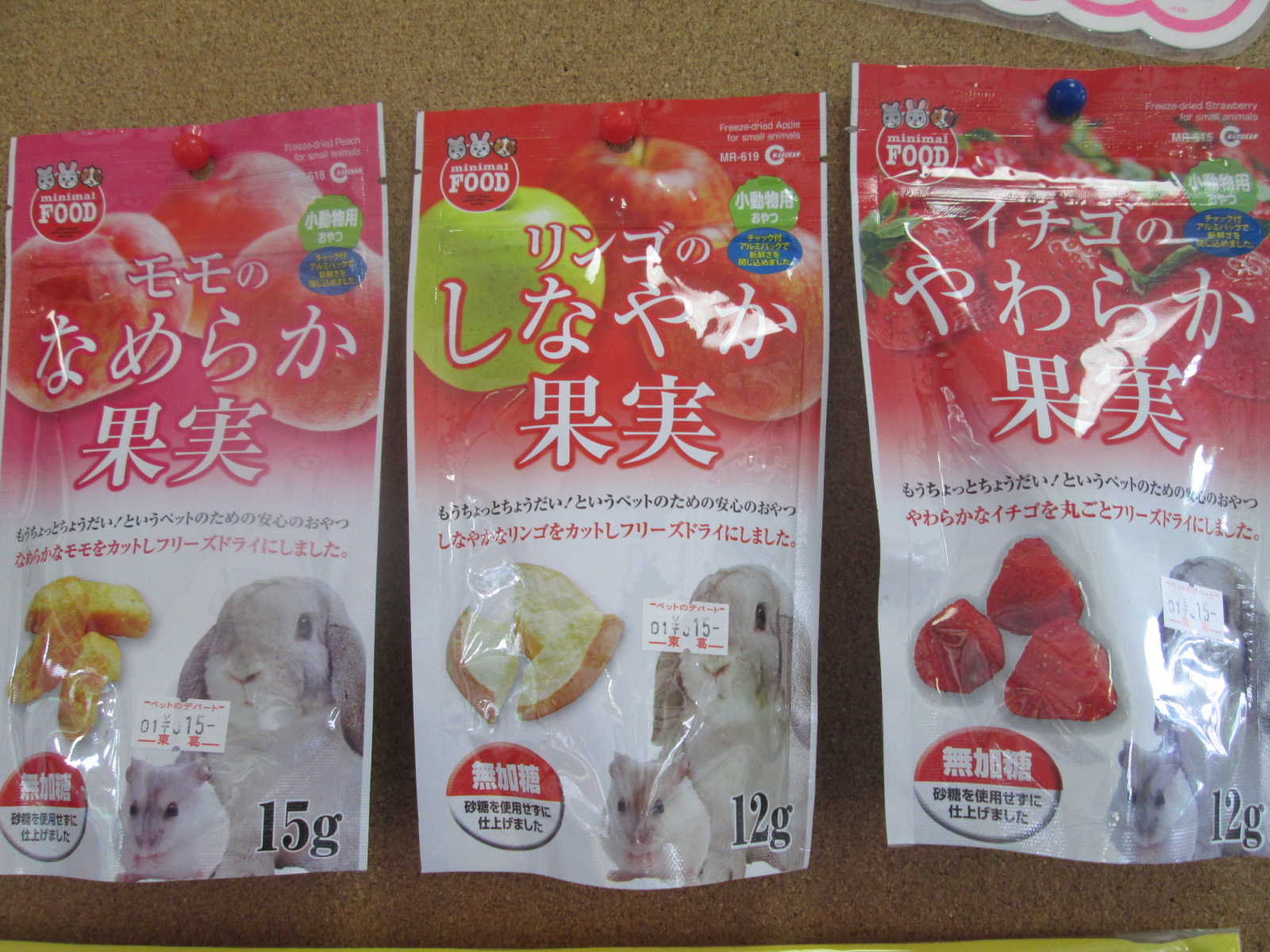 モモ、リンゴ、イチゴをそれぞれフリーズドライ加工したオヤツです。フルーツをそのフリーズドライにしているので小動物達にも安心して上げて頂けます